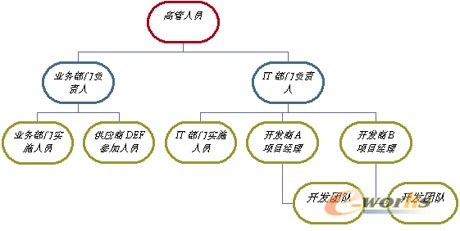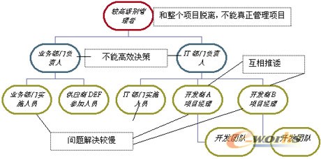 前言 项目管理者联盟 项目管理者联盟 软件开发的过程包括:用户需求分析、系统概要设计、系统详细设计、编码、测试等环节。但是对于一个企业解决方案而言在软件开发的每一个过程中由于项目组人员的复杂性可能会存在着较为复杂的情况。在本文中企业解决方案是指业务部门提出了对系统的需求,通过招投标选择了一个或多个开发商,参与项目的人员包括业务部门、企业IT部门、开发商和最终用户。此外,在这里也对企业的类型限定为功能型的组织架构,对于项目型组织架构的企业存在的问题可能相对较少一些。 项目管理者联盟 项目管理者联盟 在第一部分将介绍目前许多软件项目大多使用的组织架构及其职责,指出其不足之处,然后说明该种组织机构的实质是什么。第二部分将给出作者认为较好的组织机构,并对其职责进行了较为详细地描述。 项目管理者联盟 项目管理者联盟 在本文中基于如下的企业解决方案为例进行展开:A企业的采购部门提出了建立B2B电子商务的需求,经过和IT部门合作选择了B和C两家开发商,其中B开发商负责B2B网站的开发,C开发商负责数据分析和报表的开发。参加需求调研和参与测试的供应商包括D、E和F。 项目管理者联盟 bbs.mypm.net 1 功能型的组织架构 项目管理者联盟 项目管理者联盟 对于功能型组织架构的企业而言,对于前言中提出的B2B项目的组织架构一般而言如图1所示。这种组织机构的特点是按照企业的组织架构组成了企业解决方案的组织架构,其最上层--也就是项目经理的角色--是企业的较高级别的管理人员。在接下来的一层分别是业务部门和IT部门的管理人员。由于供应商是经常和业务部门进行沟通的,因此将供应商的相关人员安排在业务部门负责人的下面,而一般开发商和IT部门有较多的沟通,因此将开发商放在IT负责任的下面。 项目管理者联盟 转自项目管理者联盟 这种组织机构存在着以下的不足: 项目管理者联盟 项目管理培训 1) 项目经理应该对整个项目的成功负责,但是考虑到企业的高层管理人员其他相关工作已经非常满,因此很难有时间来承担起项目经理的角色。 项目管理者联盟 项目管理者联盟 2) 由于第一个先天的缺陷,导致了整个项目的决策会较为缓慢。比如当业务部门和IT部门产生矛盾时,由于较高级别管理人员可能没有时间来了解矛盾细节而导致业务部门和IT部门会就某些事情争执不下,很难达成统一的认识,导致项目的拖延。比如,就项目范围而言,可能在需求分析阶段会有不一致的地方。 项目管理者联盟 项目管理者联盟 3) 当开发商和业务部门产生了矛盾的时候--比如对需求的完成程度--解决这些问题也会较为拖延。由于问题最终需要一层一层地汇总到IT部门负责人和业务部门负责人这里进行解决。 项目管理者联盟 项目管理者联盟 4) 开发商A和开发商B产生矛盾分歧的时候解决问题也存在着困难,因为A和B都在为自己争取最大的利益,当产生矛盾时,双方会产生相互推委的现象。项目管理者联盟 项目管理者联盟 5) 由于业务部门负责人和IT部门负责人可能也有许多其它工作,因此实际上变成了业务部门实施人员和IT部门实施人员来推进项目管理。由于其所处于项目的较低层,因此处理问题的能力有限。项目管理者联盟 项目管理者联盟 总结为一句话,这种组织机构可能产生的后果就是在项目组织的职责不明确,决策缓慢,项目拖延等问题。 项目管理者联盟 PgMp.mypm.net 图1 功能的组织架构项目管理者联盟 转自项目管理者联盟 由以上分析可以将功能的组织架构可能产生的问题重新描述如图2所示,图2很清楚地表明了图1所是组织架构的问题点。在下面一节将介绍作者认为较好的企业解决方案的组织机构及其职责。项目管理者联盟 项目管理者联盟文章 图2 功能组织架构存在的问题点项目管理者联盟 项目管理者联盟 2 改善的组织架构项目管理者联盟 转自项目管理者联盟 针对于功能组织架构存在的问题点,下面将论述较好的组织架构。首先考虑到企业较高管理层人员的时间关系,因此不适合将他们放在项目经理的位置上,而是将高管人员置于评价者和支持者的位置。在上一部分谈到了业务部门和IT部门可能会存在着争执,如何解决这个矛盾,结合第一个问题点的解决,就是将业务部门和IT部门的相关负责人共同组成双人的项目经理,这里对两个项目经理的要求是业务负责人要较为精通业务但是也要具有IT的相关知识,IT负责人要熟悉IT,了解IT项目的特性并且熟悉IT项目管理和业务流程,他们也需要有充足的时间花在项目上,此外一个较高的要求是他们必须有较强的沟通能力。这样就形成了高管进行评价和支持,业务和IT相关负责人来具体管理项目的项目决策、支持和管理层。项目经理主要进行项目的范围管理、时间管理、质量管理和沟通管理。尤其值得一提的是项目的需求变更必须由项目经理牢牢把握,因为许多企业项目不能按时、按质完成的主要原因是需求变更无法有效控制,而设置业务和IT人员作为项目经理的设置方式可以有效地避免存在以上的问题。项目管理者联盟文章 talent.mypm.net 由于项目经理是管理人员,对于业务和IT一般而言并不是专家,这时考虑到IT项目在需求分析和IT架构设计阶段需要专家的支持。因此建议增加业务和IT专家对项目经理进行专业级的支持,这些专家可以来