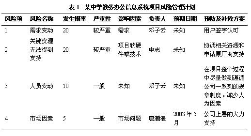 如下表表1所示,这是我主持的一个某高校教务办公信息系统项目的风险管理计划表。项目较小,我们只用了两个月的时间就开发完工,通过验收。正因如此,我们在项目计划中大量的采用了这种表格来制订人员计划、培训计划、风险计划、成本估计、文档大小估计、进度计划,一目了然,责任到人,其效果和效益是很明显的。