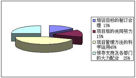 表5:入校培训项目的项目文件册 项目管理者联盟 blog.mypm.net 5、项目的风险管理 项目管理者联盟 项目管理者联盟 按照PMBOK的定义,项目风险管理包括:风险识别、风险规划、定性风险分析、定量风险分析、风险控制等基本环节;相比其他专业化很强的项目(如建筑、IT等),本次入校培训项目的风险管理难度并不是很大,因此也未采用一些特定的风险估算办法,如蒙特卡罗分析等,主要借助于项目组召开的日常规划会议来进行风险识别、风险预防的工作,列出了最有可能发生的几种风险,并确定了相应的管理方案,在这里举一个事例,为了提高广大新教师的团队意识及克服困难的勇气,本次入校培训项目中第一次引入了拓展训练环节,具体包含高空断桥、高空单杠、海难逃生、信任背摔等内容,均具有一定的危险性;为此项目组也做了大量的风险管理工作确保参训教师的人身安全,采取了如下措施:(1)对拓展训练的风险性进行了足够的评估;(2)选择资质突出的拓展培训机构;(3)事先为全体参训教师上了意外伤害保险;(4)对参训教师进行有关安全教育;(5)培训当天邀请有丰富经验的医生一同前往等;充分的风险预防、规避措施有力地保证了此次入校培训项目的平稳顺利进行; 项目管理者联盟 项目管理培训 6、项目的成本管理 项目管理者联盟 项目管理者联盟 一般来讲,成本的估算方法有如下几种:自上至下、自下至上、参数模型、专家估计、估测等;本次入校培训项目采取了自下至上及估测相互结合的办法,项目组成员在详细的工作分解结构WBS的基础之上,凭借经验对各个工作包的花费进行了估测,对于会议物品的购置、食宿的费用等一些可能支出较大的成本项目,进行了“货比三家”式的重点管理,从而有力地保证了预算的科学性和准确性。 项目管理者联盟 PgMp.mypm.net 除了上述所提到的几类管理之外,项目组还使用了专业的项目管理软件PROJECT 2002对入校培训项目进行了时间管理,得出了甘特图和单代号网络图,因本文篇幅限制,就不在此赘述了。 项目管理者联盟 结束语: pmp.mypm.net 项目管理者联盟 从意见反馈来看,本次培训的满意度较之2005年有了大幅度提高,在工作总结的时候,项目组进行了一个小范围的问卷调查,调查结果显示:项目组成员普遍认为,在入校培训中引入规范的项目管理方法是促使其成功的主要原因之一,如图3, 项目管理者联盟
