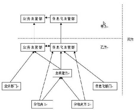 转自项目管理者联盟 项目管理者联盟 图1 一般监理机制中的各方关系training.mypm.net 项目管理者联盟 对于政府信息化工程来说,因涉及面广,单一政府部门能力有限,尤其是技术性管理能力不足。甲方往往是业务主管部门或信息化主管部门,甚至有时信息化主管部门直接扮演工程指挥者或协调者的角色。乙方即即工程的建设方,则可能组织结构复杂些,尤其是一些大型的政府信息化工程,往往会涉及分包商。这时,丙方即监理方将在业务主管部门或信息化主管部门的指挥和协调下进行监理工作,见图二。项目管理者联盟文章 项目管理者联盟