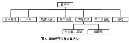 表4:工作量估测结果 pmp.mypm.net 项目管理者联盟 下一步要对工项根据工作包大小进行分解和合并,确定原则可根据组织的管理进行确定。如果某单工项工作量过大,则可将其分解为几个工作包,例如表3中的“砖墙装配”这个工项可以分解为“前后墙砌建”和“侧墙砌建”等两个工作包;如各工作量过小的工项,则可以合并为一个工作包,但所合并的各工项应可以安排一个人或一个考核单位负责。同时某一单独的通用步骤也可同时应用于各个产品部件而成为一个工作包,这时候这个通用步骤就不再向产品分解结构的各末端叶点,而是适用于某一中间结点,如表3中的所有部件“合同签订”可合并为一项“合同签订”工作包。通过这种方式确定的工作包,即为工作分解结构的最低层次,示例中的工作分解结构如图6所示。项目管理者联盟