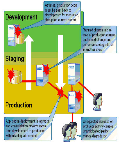 著名的作家和商业顾问,Roger Burlton,曾经将一个成功的消费品公司的一年时间描述为: service.mypm.net pmp.mypm.net “在这一年中,该公司将主要的客户注意力转移到电子商务方面,将销售的机理模式转变为新型的网络市场模式,同时考虑到竞争对手的反应,将产品价格降低40%。并且在5个国家中开设或整合分支机构,每个分支机构都具有不同的规章要求。然后该公司将被巨型的全球性的竞争对手购并,该对手不具备电子商务的手段或网络渠道。他们一起将成为在该行业中世界性的主要厂商。然后该公司为了巩固其地位将收购同行业中其他具有互补产品的网络市场公司,并与之合并。” 虽然这个公司在一年中变化比较大,但是这是一个典型的现象。今天的商业在一直发展变化。所有公司都应该应对不断变化的市场压力,同时将成本最小化。 blog.mypm.net talent.mypm.net 1.产生变化的原因 项目管理者联盟文章 bbs.mypm.net 剧烈的竞争,使得产品大众化并缩短了商业周期,强迫公司采用自动化的操作并降低成本。 service.mypm.net 项目管理者联盟 期望的投资者回报,需要成长性,这意味着开发新的市场和产品,也包括并购。 转自项目管理者联盟 转自项目管理者联盟 实用的新技术,例如互联网以及丰富的开发框架,强迫公司尽快开发出先进的应用,以保证能在市场中生存。 项目管理者联盟 项目管理者联盟 几乎所有的业务变化都会影响到支撑这些业务的IT应用和基础设施。新的市场和产品或者需要新的应用系统或者需要现有应用系统的完善。并购也将产生集成项目,以及应用的整合。一般来说,应用环境的变化反映了组合业务模式的变化。 转自项目管理者联盟 项目管理者联盟 组织战略与行动计划→应用环境变化 项目管理者联盟 项目管理培训 这里持续的环境变化给IT组织带来了重要挑战。当问IT专家最重要的3个应用管理挑战时,大部分回答都包含了变化。 项目管理者联盟 项目经理圈子 ●最值得注意的包括: 项目管理者联盟 ●部署新的应用 项目管理者联盟 ●现有应用系统的变化 talent.mypm.net ●应用的集成和整合 转自项目管理者联盟 项目管理培训 简单地说,IT组织陷入了变化的沼泽,面临着由此带来的无数问题。 blog.mypm.net 项目管理者联盟 2.无计划的变化 service.mypm.net 项目管理者联盟 应用环境的持续变化带来的最重要问题中包含着一些意外的副作用。实际上,很多性能和可用性问题和生产环境中应用的故障是与应用环境的无计划的变化有关的。试举几个无计划的变化示例:用户活动的意外增长可能对应用的性能产生负面影响。例如,一次成功的市场活动可以促使更多的购物者涌向电子商务网站,或者促使柜台交易量急剧增加,超过了开发人员的预计,这些负载可能导致应用的故障。上线的代码的变化可能存在意外的副作用。一个模块中较小的改变可能会给其他模块的性能带来严重影响,甚至可能造成故障。经验丰富的应用开发人员知道每次接触应用都会带来应用故障的风险,尽管这些变化看起来多么符合流程。基础设施配置的变化也可能对应用的性能产生巨大的影响。数据库或应用服务器配置的变化经常是上线应用故障的原因。 转自项目管理者联盟