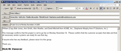 项目管理者联盟 这种语言会引起麻烦,因为它可能有许多种意思:一个EDI事务、两个系统间的一个FTP交换、交换信息格式的两个定制插件接口、一个XML文件、通过MQ系列标准产品进行连通、SQL数据库复制、或两个系统交换数据的其它方式。 项目管理者联盟 项目管理论坛 5:确定风险 项目管理者联盟 PgMp.mypm.net 由于IT项目经常要与供应商、顾问与承包商打交道,IT项目可能会引起特殊的风险。例如,如果你的组织将Acme IT服务承包出去,以方便即将进行的Active Directory和Windows 2000专业版向Windows XP专业版移植,你可能会面临Acme IT服务停止运行、得到一个“更加重要”的客户,或工作效率差的风险。 项目经理圈子 club.mypm.net 每个风险元素——资源、进度、性能、成本等——都应进行评估。这些任务通常任命给项目经理或与任务关系最密切的个人来完成。定期风险评估与跟踪是项目进程的尽职调查环节。项目周期内的风险表示本身也应有求助对象。例如,如果Acme IT服务把你的项目留给了另一个客户,要保证有求助对象和该机构合作。 项目管理者联盟 pmp.mypm.net 6:与外方人员搞好关系 项目管理者联盟文章 项目经理博客 IT项目几乎总是有一些外方人员参与进来。这些外方人员包括: 项目管理者联盟 pmp.mypm.net 顾问 项目管理者联盟 商业伙伴 转自项目管理者联盟 项目管理者联盟 服务提供商 training.mypm.net 项目管理者联盟 供应商 www.mypm.net 项目管理者联盟 软件发行商 pmp.mypm.net 转自项目管理者联盟 设备制造商 项目管理论坛 项目管理者联盟 外方人员参与到项目中将增加项目适当可交付项的资源与能力。但是,要保证每个组织的任务与需求清楚明了。项目计划应指定一个人来管理与外方人员的关系与实用性。如果你们组织一次执行多个项目,则这个人可以为所有活动项目执行这一功能。 项目管理者联盟 项目管理者联盟 7:保持强大的资料标准 pmp.mypm.net 项目管理者联盟 资料是IT项目成功的关键,项目执行后需要进行改变时更是如此。要保证你们组织拥有明确定义的资料预期,以及各种类型资料的标准化储备库。如果要执行定制开发,则修订控制机制也很重要。项目管理者联盟 项目管理者联盟 另外,定义资料需求的资料也很重要。这种要求可能有些过分,但随着项目变得愈加复杂,这种做法对项目执行和管理的成功很有价值。 www.mypm.net blog.mypm.net 强大的资料标准为IT项目带来如下好处: 项目管理者联盟 项目管理者联盟 更容易吸收新团队成员 项目管理者联盟 项目管理者联盟 以后,与这一努力有关的工作更容易启动。 项目管理培训 blog.mypm.net 开始或测试功能改变会更容易。 项目管理者联盟 项目管理者联盟 8:建立有效的通信渠道 pmp.mypm.net 项目管理者联盟 项目管理应保证清晰的通信。电子邮件似乎是首选的通信方法,但它很容易变得数目庞大,让人吃不消,从而使效率低下。一个普遍的良好做法是在需要响应时确定特定的个人。适当的使用致:与抄送:域,就可以避免谁该如何做这样的不明确信息。图A显示的是一个列举特殊责任的电子邮件通信实例。 blog.mypm.net 图A 项目管理者联盟 项目管理者联盟 项目管理者联盟 项目管理者联盟 项目管理者联盟