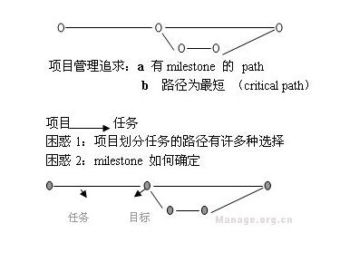 项目管理:解决了具体模块的问题; talent.mypm.net service.mypm.net 全面质量管理(TQM):其居于量化管理与项目管理之间,处于中间状态。 项目经理圈子 项目管理者联盟 service.mypm.net 项目管理培训 四、项目管理中的关键问题--如何立项 talent.mypm.net 项目管理者联盟 首先让我们来看事件的组成结构图: PgMp.mypm.net PgMp.mypm.net blog.mypm.net 项目管理者联盟 事件模型将企业的全部事件进行了层级上的划分,简单说明:系统也是一个公司的核心,是企业为其发展所制定的整体战略目标,通过目标分别将各计划立为工作项目,进而分解为任务乃至活动。 项目管理者联盟 项目管理者联盟 在立项之后,如何对项目本身进行管理? www.mypm.net pmp.mypm.net 项目管理者联盟 项目管理者联盟文章 OGSM解决了从目标到计划的转换工作。 项目管理者联盟 blog.mypm.net 目标计划项目 项目管理者联盟 项目管理者联盟 计划是一个整合性的立体性目标,是多维的,如:综合了人、财、技术等;而项目则是单一的,它是一维的,每一维即一个项目。 pmp.mypm.net 项目管理培训 项目管理者联盟 talent.mypm.net 项目的特点:项目具有独立性、项目时间不跨年 项目管理者联盟 PgMp.mypm.net 注:立项时切忌计划的维度设置不完整,从而导致漏掉某些项目类,影响计划的完成。 项目管理者联盟 项目管理者联盟 五、关键路径法--项目如何划分为任务 项目管理者联盟 blog.mypm.net 如果项目为一条线段的话,要继续划分项目下的任务,就需要利用关键路径法来进行划分。 项目管理论坛 club.mypm.net 关键路径的要素:a两点间必存在道路(path) 项目管理者联盟 项目管理者联盟 b道路间必有里程碑性的标志(milestone) 项目经理博客 training.mypm.net 项目管理论坛 项目管理者联盟 任务目标 项目管理者联盟 项目管理者联盟 milestone是任务的目标(节点);任务是节点之间的路线 项目管理者联盟 bbs.mypm.net 其中,对目标的判断以产生分支或成为汇集点为标准(如下图) 项目管理者联盟 项目管理者联盟 club.mypm.net 项目管理者联盟 任务的特点:任务的时间不过月,且具有连续性即:一个任务完不成,下一个任务无法开展 项目管理者联盟 项目管理者联盟