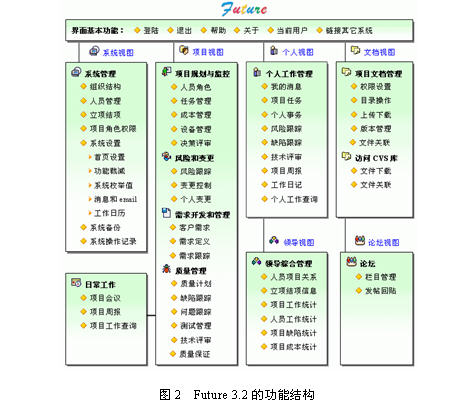 项目管理者联盟 SPP的主要优点: 项目管理者联盟 PgMp.mypm.net ◆SPP融合了CMMI、项目管理与软件工程知识,定义了易于执行的软件开发和项目管理规范(约60页文本)。过程模型清晰直观,机构领导、项目经理、项目成员(开发人员、测试人员等)很容易知道自己“应该在什么时候、按照什么规范做什么事情”。SPP模型有助于企业各个职能单位有条不紊地开展工作。 项目管理者联盟 项目管理者联盟 ◆用户可以根据本企业的特征,适当地裁剪或扩充SPP的过程域,很容易制定出最适合于本企业的过程模型。 项目管理者联盟 项目管理者联盟 SPP的主要缺点是:它不是标准,也没有相应的认证,不具备CMM/CMMI、ISO9000认证的宣传价值。 项目管理者联盟 项目管理者联盟 5. 集成化项目管理Future 项目管理者联盟 转自项目管理者联盟 Future是和SPP方法论配套的集成化项目管理系统,主要功能有:组织结构和人员管理、立项与结项、项目规划与监控、需求开发与管理、风险跟踪和变更管理、质量管理、配置管理、日常工作管理、领导综合管理、论坛等。Future的功能结构如图2所示。 项目管理者联盟 项目管理者联盟 Future的目标是“让项目管理变得简单有效”,主要客户是国内中小型IT企业,主要最终用户是IT企业的研发主管、项目经理、开发人员、测试人员和质量管理人员等等。 项目管理者联盟 项目管理培训 项目管理者联盟 bbs.mypm.net Future软件的主要优点是: 项目管理者联盟 项目经理圈子 ◆物美价廉、富有成效的集成化项目管理工具。 转自项目管理者联盟 项目管理者联盟 Future将最常用的项目管理工具全部集成于Web环境,企业不必购买多个分立的管理工具,避免了管理工具之间不兼容、数据孤立的问题。不仅提高了研发管理效率,而且大大降低了购买工具的成本。 项目管理者联盟 talent.mypm.net Future软件不仅可以为企业建立完备的研发管理数据库,而且帮助企业领导对所有项目的人员、进度、工作量、成本、质量进行分析,为研发绩效考核提供客观依据。 PgMp.mypm.net 项目管理者联盟 ◆容易扩展、与流行软件兼容 项目管理者联盟 blog.mypm.net Future的所有页面数据可以导出到Excel和Word文件;可以导入、导出 MS Project 数据文件; 项目管理者联盟 Future可以访问配置管理软件CVS的文件库; blog.mypm.net 项目管理者联盟 Future将集成更多的工具,如客户服务管理系统、人力资源管理系统等。 training.mypm.net pmp.mypm.net 为了方便地和企业现有的管理系统交互信息,我们提供编程接口,并帮助用户对Future进行二次开发。 项目管理者联盟 项目管理者联盟 小结:SPP和Future是国内“土生土长”的研发管理方法和工具,比较适合国内中小型IT企业的需求。这些IT企业采用 SPP 和 Future后,有助于快速平稳地提升研发管理能力,付出的成本和精力相比于CMM/CMMI要低得多(大约不到20%)。 www.mypm.net 项目管理培训 作者:上海漫索计算机科技有限公司 林锐博士service.mypm.net