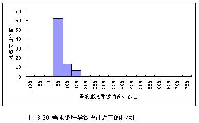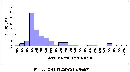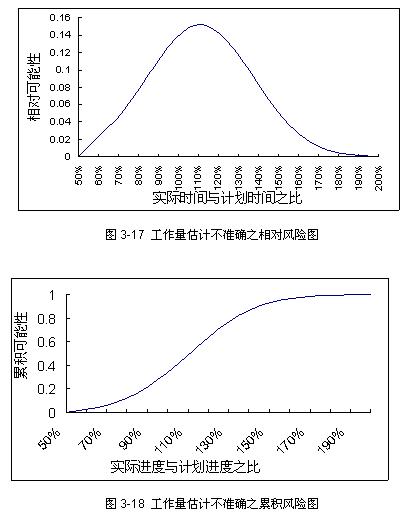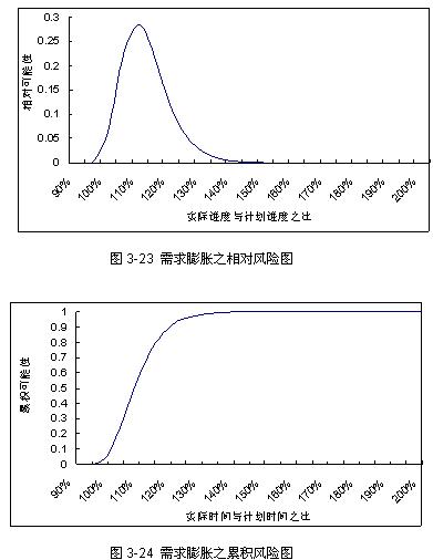 项目管理者联盟 从图3-16可以看出,工作量偏差分布基本上符合正态分布。使用非线性回归统计工具NLREG进行工作量数据拟合,得到工作量偏差分布符合正态分布N(10.8%,26.3%)。也就是说,大约有68%的软件项目,其工作量变化范围在(-15.8%,46.1%)之间。 项目管理者联盟 项目管理者联盟 软件项目工作量估计不准确的影响是明显的,当估计的工作量小于实际需要时,项目的人力投入会减少,或者进度时间点会提前,这两种情况都将会使项目的实际成本更高,项目组成员的士气降低。当估计的工作量大于实际需要时,项目的人力投入会增加,或者进度时间点会推迟;这将使项目组成员得不到充分的使用。 项目管理者联盟 项目管理者联盟 在人力资源投入情况确定后,“工作量估计不准确”风险因子对项目进度的潜在影响可以等同于工作量偏差分布。从而构造“工作量估计不准确“风险因子的风险图如下,图3-17为相对风险图,图3-18为增量风险图。 项目管理者联盟 项目管理者联盟 项目管理者联盟 项目管理者联盟 从图3-18可以看出,即使对以前的项目或者企业的历史数据一无所知,最初的工作量估计,不管是出自计算还是一个强制的命令推算而来,会导致项目延期至少10%以上。这是因为,累积可能性为0.5的水平线与曲线相交的一点,它的实际进度与计划之比大概为110%或者更多一些,也就是说,项目实际进度时间是计划时间110%的可能性至少有一半。 项目管理者联盟 club.mypm.net 3.4.2 需求膨胀风险因子影响图曲线 项目经理圈子 项目管理者联盟 对需求膨胀的调查问题主要集中在它的两个影响:(1)新增需求或者需求变更,将导致新的开发任务,并进而增加工作产品的规模;(2)新增需求或者需求变更,将导致针对原有需求的返工任务。 bbs.mypm.net 项目管理者联盟 由于需求变更而导致新的开发任务 项目管理者联盟 项目管理者联盟文章 调查者被请求估计由于新增需求或者需求变更带来的工作产品规模变化有多大,调查结果如图3-19所示。 项目管理者联盟 PgMp.mypm.net club.mypm.net 项目管理者联盟 尽管有7个调查者报告说需求变更使得他们项目的产品规模减少了,但是需求变更还是引入了新的工作任务。大多数调查者报告显示需求变更都使得工作产品的规模变大了。从图上可以看出,新增需求或者需求变更导致工作产品规模变化的平均值为9%,变化范围主要集中在(0%,15%)之间;新增需求或者需求变更导致工作产品规模变化最大量为72%。 项目管理者联盟 项目管理者联盟 由于需求膨胀导致的返工 项目管理者联盟 项目管理者联盟 调查者被请求估计由于新增需求或者需求变更带来的软件工作产品返工百分比。调查结果如图3-20所示。 项目管理者联盟 转自项目管理者联盟 新增需求或者需求变更带来的软件工作产品返工百分比集中在(0,5%)区间之内,返工平均值为3%。 项目管理者联盟 项目管理论坛 转自项目管理者联盟 项目管理培训 关于返工生产率 club.mypm.net talent.mypm.net 对于需求膨胀而导致的新开发任务,可以认定其生产率与需求膨胀前项目的平均生产率一致。对于需求膨胀而导致的工作产品返工,其生产率与开发新产品的生产率则可能不同。问卷调查中设计了“返工生产率与开发新产品的生产率是否大小一致?如否,返工生产率是新产品开发生产率的多少倍?”这个问题,75%的项目经理报告说这两者的生产率一致,所有调查者的结果分布如图3-21所示。 项目管理者联盟 项目经理圈子 项目管理培训 service.mypm.net 关于需求膨胀的调查结果表明,项目由于新增需求或者需求变更导致了新开发任务或者返工,这些新开发任务或者返工给项目带来了额外的工作量,影响了项目正常开发的进度。从调查结果可以发现,新开发任务生产率与返工生产率基本一致,因此,可以通过简单的迭加方法,得到需求膨胀对项目进度的影响程度。根据图3-19和图3-20的结果,需求膨胀对项目进度影响如图3-22所示。项目管理者联盟 talent.mypm.net www.mypm.net PgMp.mypm.net 从图3-22可以看出,需求膨胀对项目进度的影响呈偏态分布,大量取值在左边,少量在右边,且比较分散,比较接近对数正态分布。使用非线性回归统计工具NLREG进行数据拟合,得到需求膨胀对进度影响分布符合对数正态分布LN(2.75%,1.5%)。可以简单地认为,需求膨胀对进度造成的影响符合特定的对数正态分布,从而构造“需求膨胀风险因子”的风险图如下。图3-23为相对风险图,图3-24为增量风险图。项目管理者联盟 blog.mypm.net 项目管理者联盟 PgMp.mypm.net 从图3-24可以看出,由于需求膨胀的原因,项目实际时间是计划时间的110%的可能性至少有一半。 项目管理论坛 项目管理者联盟 3.4.3 人员流失风险因子影响图曲线 项目管理者联盟 项目管理者联盟 所有调查者被请求回答项目组成员流失的比例,调查结果整理如图3-25所示。 项目管理者联盟