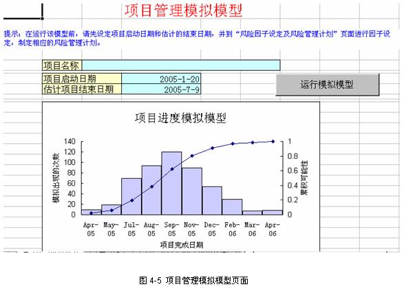 项目管理者联盟 开始日期:表明从哪天开始就需要关注该风险了,一般是监控风险的转化指标。 项目管理者联盟 talent.mypm.net 结束日期:表明从哪天开始就不再需要关注该风险了,无论其是否规避、减轻、转移,或者是根本就没有发生。 项目管理者联盟 项目管理者联盟 执行结果:针对该风险的处理结果及措施有效性评价。通常包括:关闭——措施有效、关闭——措施无效、关闭——风险没有发生等等。 项目管理者联盟 项目管理者联盟 项目管理模拟模型页面 项目管理者联盟 项目管理模拟模型页面是本模拟模型的结果显示页面。点击“运行模拟模型”按纽,系统就会自动生成项目进度模拟模型统计图,该图既显示了每一种模拟结果出现的次数,也显示了累积可能性。图4-5显示9月5日前完成项目的可能性为60%。 项目管理者联盟 service.mypm.net 项目管理论坛 项目管理者联盟 4.6 模型使用案例 blog.mypm.net PgMp.mypm.net 项目经理小吴从产品经理那里接受到一项任务,开发一款宽带接入设备的软件系统,该系统主要支持:1)用户接入、认证和管理功能;2)业务配置功能;3)地址管理功能;4)5级QOS调度。产品经理在安排任务的同时,提出了对项目组的期望,希望项目组能够在4个月内开发完成,产品提供的人力资源在30人左右。小吴并没有当场拍胸脯说能够完成任务,而是说下去后计划一下,看看能否按时完成任务。产品经理同意了他的请求。 项目管理者联盟 转自项目管理者联盟 小吴在数据通讯领域工作了近10年,其中有6年项目管理经验,业务领域知识和项目管理知识都非常丰富。小吴下来后,仔细研读了由产品提供的需求文档。小吴认为,需求文档写得非常清楚、完整,可以作为下一步工作的输入。小吴根据自己对产品需求的理解,对产品进行了适当分解,初步估计出软件项目代码规模在95千行代码行左右。如果根据历史项目的生产率数据,以及可能得到的30个人力资源,小吴估计完成该项目需要103个工作日,基本能够满足产品经理的要求。 项目管理者联盟 pmp.mypm.net 但是,小吴对于能否在103个工作日内交付该软件系统显得信心不足,因为这个项目存在一些不确定性,比如项目需求是否会发生变更?虽然有30个人力资源,但是否都具有项目所需要的技能尚不可知。后来,小吴通过其他人了解到有一种基于风险因子分析的软件项目管理模型,该模型量化分析了6种主要风险因子对软件项目进度的影响,可以模拟出比较合理的进度计划。于是,小吴决定使用该模拟工具,帮助自己制定项目进度计划。 service.mypm.net 项目管理者联盟 小吴打开“基于风险因子分析的软件项目管理模型”,首先按照模型的提示,输入了项目的计划启动日期“2005-02-24”和初步估计的结束日期“2005-06-30”。之所以将结束日期设定为“2005-06-30”,是考虑了“五一”国际劳动节假期和每周6个工作日的工作制度。接着,小吴打开了“风险因子设定及风险管理计划页面”,仔细研究了6种风险因子及其描述内容,认为这6种风险因子在项目组都有可能存在,于是,他将这6种风险因子的状态全部设定为“打开”。对于“工作量估计不准确”、“需求膨胀”、“项目组成员流失”这三种风险因子,他决定使用缺省的风险图数据;对于“对项目平台/环境/方法不熟悉”、“缺乏关键人员”这两种风险因子,他决定使用严重程度为“一般”的缺省风险图数据;对于“缺乏高级管理者承诺和支持”风险因子,他选择的严重程度为“中立状态”。 项目管理者联盟 项目管理者联盟 设定完成后,小吴点击了“运行模拟模型”按纽。模拟模型经过500次模拟,输出了项目进度模拟风险图,从图上可以看出,项目在7月5日之前完成的可能性仅有10%左右,在9月5日前完成的可能性大概在50%,项目在2006年3月完成的可能性为100%。 项目管理者联盟 项目管理者联盟 小吴带着这些结果数据找到产品经理,并向产品经理介绍了模拟模型的原理和涉及的6个主要风险因子,以及这些风险因子对项目进度的影响。产品经理对模拟模型的思路表示肯定,也认同运行结果的可信度。然后,产品经理再一次强调了产品的战略意义,并指出,及时在海外,尤其是欧洲市场推出这款设备,将使我们在激烈的竞争环境中占据主动权,对提升产品的品牌效应和市场占有率大有好处。 项目管理者联盟 training.mypm.net 产品有市场进度压力,但按时完成又几乎不可能。如何解决这个矛盾?产品经理建议小吴与他一起分析这6个风险因子,并寻找一些降低风险影响程度的措施。首先,产品经理表示,鉴于产品的战略意义,公司高级管理者已达成共识,将不遗余力地支持和关注该项目,优先满足项目的各项资源需求。因此,产品经理建议,将“缺乏高级管理者承诺和支持”风险因子关闭。小吴接受了产品经理的建议。对于“工作量估计不准确”风险因子,小吴和产品经理一致认为,下来后需要邀请项目组骨干成员和部分业务领域专家,使用正式的软件估计方法,估计软件项目工作量;并且在后续的软件需求分析、软件设计等阶段结束时,重新估计项目所需要的工作量。对于“需求膨胀”风险因子,小吴向产品经理提出了如下要求:1)产品使用多种方法收集、确认客户需要,并详细地文挡化;2)对于客户提出的需求变更请求,产品需要认真分析,适当控制变更的规模和时间点;3)当需求变更时,要使用正式的方法通知到相关