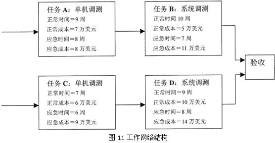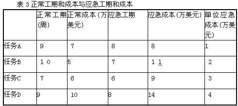 2.深圳地区传输系统的单机调测和系统调测。以代号C代表该系统的单机调测,以D代表该系统的系统调测。分配给任务C的预算为6万美金,正常情况下的工期为7周;在应急情况下,如果增派人员和测试设备,工期最多可缩至6周,同时任务成本上升至9万美元;分配给任务D的预算是10万美元,正常情况的工期是9周,应急情况如果增派技术更为熟练人员和配备更先进的测试设备,压缩至8周,同时饪务成本上升至1 4万美元。系统的调测工序决定了任务C完成后,才能开始实施任务D。 项目管理者联盟 项目管理者联盟 压缩任务A、B、C、D工期而增加投入的资源主要是人员和测试设备。在XX公司,人员成本是以工时计算的,与时间呈线性关系;另外,测试设备是公司“租”给项目使用的,项目使用公司的设备也需按使用的时间计算费用计入项目的成本,其使费用的计算与时间呈线性关系。任务A、B、C、D基本上满足时间一成本平衡法的使用前提,网此可以利用时间一成本平衡法评估工期缩短对整个项目成本的影响。单位应急成本是指压缩一周额外增加的成本,任务A的单位应急成本为: PgMp.mypm.net (应急成本一正常成本)/(正常工期一应急工期) 项目管理者联盟 项目管理者联盟 =(9—8)/(9—8)=1万美元 service.mypm.net 项目管理者联盟 同理可得其他任务的单位应急成本。任务A、B、C、D的正常工期、正常成本、应急工期、应急成本和每周应急成本如表:3: 项目管理者联盟