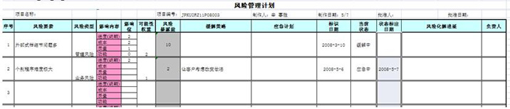 www.mypm.net 项目管理者联盟 项目管理者联盟 项目管理论坛 项目管理者联盟 使用风险管理来保证项目正常运转 项目管理者联盟 www.mypm.net 风险涉及到项目的方方面面,现代的软件工程都强调风险驱动。在项目管理成熟的情况下,通过分析、监控、缓解、应对项目的风险,从而保证项目在正确的轨道上运行。 training.mypm.net 项目管理者联盟 风险跟踪表 项目管理者联盟 项目管理者联盟 风险分析 service.mypm.net 项目管理者联盟 风险的趋势分析(暂无图表) PgMp.mypm.net 风险转变为威胁的跟踪与原因分析(暂无图表) 项目管理者联盟 风险与损失分析(暂无图表) 项目管理者联盟 项目管理者联盟 鸣谢 项目管理者联盟 项目管理者联盟 本文的数据使用了项目组的具体数据,为此感谢做出贡献的所有人,考虑到其它因素,此处不列出大家的名称。 项目管理者联盟
