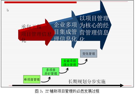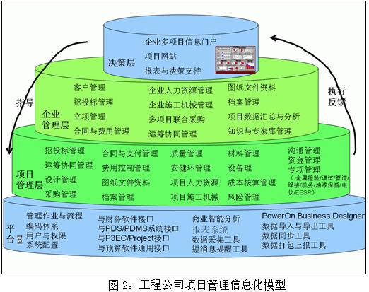 项目管理者联盟 国内传统PMIS的问题在于缺乏项目管理的专业特征,例如某一流程的启动是否合理无依据可循:也许这个流程的相关事情几周前就应该启动了,抑或过几周再启动这个流程也不晚。原因在于MIS和OA往往不怎么考虑组织的时间管理问题,没有在组织统筹计划下驱动组织内部的行为设计理念。这样的协同可称之为‘无源之协同’。 项目管理者联盟 项目管理论坛 国内传统PMIS的应用,可以在局部有限提高企业的管理水平,但却无法对企业项目管理水平产生质的提高, 项目管理者联盟 PgMp.mypm.net 3. 工程公司项目管理信息化的模型 项目经理圈子 项目管理者联盟 针对项目管理信息化,不同层面关心的问题各部相同。首先对工程公司各个层面对于项目管理信息化的需求进行分析,:1)决策层:主要关心系统能否辅助决策,能否实现可视化项目管理;2)企业管理层面:重点是对众多项目的管理控制、资源协调、项目配合管理; 3)项目管理层面:重点是业务管理标准、科学化、信息化;通过项目仪表盘直观反映项目健康状况。4)具体操作人员:主要是简单易用,可以借鉴历史经验。 项目管理者联盟 pmp.mypm.net 对公司层面项目管理部门而言,重点是项目运用标准的项目管理方法、项目目标与执行绩效的在线式监视分析、项目问题与风险的提前预警。在此基础上,项目管理部门希望建立标准数据库、知识库,希望持续改进整体的项目管理水平。 pmp.mypm.net 项目经理博客 对具体项目而言,面对大型复杂的项目时,最想达到的管理境界是:工期进度在多方统筹的总计划目标下有序前行;费用控制得法尽可能减少财务费用;合同执行控制严密,形成关于概算或内部概算---合同---支付的对比核销管理;项目执行过程的工期、投资、质量风险较早得到预警; 项目管理者联盟 pmp.mypm.net 为此,可以把工程公司的项目管理信息化模型分为两个层面:企业层面和项目层面。 项目管理者联盟 企业层面,项目管理信息系统必须包含如下特征: 转自项目管理者联盟 项目管理者联盟 ·多项目并行管理; 转自项目管理者联盟 ·以项目协调企业资源与职能配合,多项目并行监控; ·以项目管理的诉求有效集成企业其他管理系统; 项目经理博客 ·执行层、管理层、干系人层共同的工作平台; 项目管理者联盟 pmp.mypm.net 项目层面,项目管理信息系统必须包含如下特征: 项目管理者联盟文章 项目管理论坛 ·以计划为主导的统筹协同,否则时间管理缺位,是传统MIS系统; 项目管理者联盟 ·以范围管理为导向的集成管理,否则层次化业绩考核无依据,是传统的职能管理系统; 项目管理者联盟 ·赢得值的应用,否则项目经理失去控制的杠杆; 项目管理者联盟 pmp.mypm.net 基于上述需求及理解,得出工程公司信息化业务模型如图2所示: 项目管理者联盟 项目管理者联盟 项目管理者联盟 www.mypm.net 同时,工程公司的项目管理信息化也不是一蹴而就的,需要依据企业的项目管理成熟度和IT成熟度,长期规划分步骤实施。如图3: bbs.mypm.net service.mypm.net 项目管理者联盟 项目管理者联盟 4. 应用PowerOn提升工程公司项目管理水平 项目管理者联盟 项目管理培训 4.1为什么选择PowerOn blog.mypm.net 项目管理者联盟 目前,国内众多的工程公司选择普华的项目管理集成系统(PowerOn)作为企业项目管理信息化解决方案。这些企业包括核工业第五研究设计院、上海工程化学设计院有限公司、上海隧道工程股份有限公司、西北电力设计院、中南电力设计院、广东火电工程总公司、四川东方电气工程分公司、中国机械设备进出口总公司、四川天一科技股份有限公司等单位。 PgMp.mypm.net 这些企业在选择项目管理信息系统的时候,都提出如下的问题:1)系统必须解决当前的问题:系统需要具有现代项目管理思想,需要包含了工程公司管理主要业务需求(计划进度\费控(成本)\合同\采购\HSE\文档等管理)。2)系统又满足发展的需求:需要有多项目管理的底层设计,能够实现公司项目化集约经营管理。3)软件供应商应具备专业的技术服务能力。 项目管理者联盟 blog.mypm.net 普华的项目管理集成系统(PowerOn)就是为工程公司量身定做的企业级多项目管理集成系统。PowerOn以PMI的九大项目管理知识体系为主导思想,以成熟的IT技术为手段,将现代项目管理理论、国内项目管理规程与习惯、项目管理专家的智慧、P3系列软件等集成到一起,通过专业管理+平台+门户的模式,实现长期以来大家渴望的‘以计划为基准,衍生出职能部门配合计划,达到将各项业务以计划形成串联的目的’,使项目管理水平质的提高成为可能。 项目管理者联盟 PowerOn以计划为龙头运筹系统、以合同为中心全面记录、以费用管理为核心深度控制,嫁接先进的、与国际接轨的项目管理方法体系(理论、工具、技能和方法),依托普华15年的项目管理应用实践经验,为项目型企业构建跨区域、分布式的多项目管理平台,跨越企业从业务操作层、管理层、决策层三个不同层次的实际需求,满足单项目管理、多项目管理、项目组合管理及企业集约化经营的要求。实现企业信息化从承包工程项目管理信息化--企业多项目集成管理信息化--以项目管理为核心的经营管理信息化这一过程。 service.mypm.net 项目管理者联盟 4.2PowerOn的产品构成 项目管理者联盟 项目管理者联盟 本文为项目管理者联盟联盟会员原创文章,授权发布,非