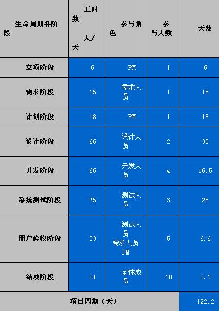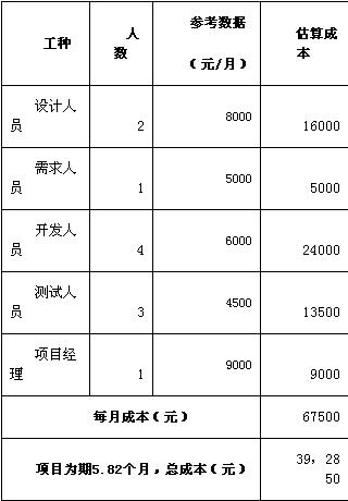 项目管理者联盟文章 两个项目的规模相当,这是我们进行估算的依据,根据之前对项目总工作量的估算(300人/天),那么就可以得到本项目各个阶段的工作量分布,如表3所示: 项目管理培训 表3-本项目各生命周期工作量分布 瀑布模型生命周期各阶段 项目管理者联盟 项目经理圈子 Ø 如何对项目工期进行估算 项目管理者联盟 假设本项目采用瀑布式的开发模型,并且所需资源与组织级度量库中的历史项目A相同,根据表3对各个生命周期阶段工作量的估算,以及表1对各种资源的估算,那么通过表4的计算就可以得到完成本项目所需要的时间。 项目管理者联盟文章 talent.mypm.net 假如每月按照21个工作日进行计算,那么本项目估计5.82个月后可以结束。 项目管理论坛 表4-对项目周期的估算 项目管理论坛 项目管理者联盟 Ø 如何估算项目的成本 项目管理者联盟 假如本项目所使用的资源与项目A相同,那么就可以参考组织度量库中2008年各种资源的平均成本,如下图所示: 项目管理论坛 项目管理者联盟 项目管理者联盟 blog.mypm.net 经过对项目周期的估算,可以得知本项目大概需要5.82个月的时间。基于以上数据就可以通过表5来对项目的成本进行估算,其结果如下所示: 项目管理者联盟 表5-本项目成本估算 项目经理博客 项目管理者联盟 至此,对项目的规模、成本、工作量、资源和工期的估算方法和顺序就介绍完了,通过本文的介绍,希望广大项目管理人员可以掌握项目估算的技巧。对于使用客观方法进行估算时,组织级的度量数据是关键核心点。另外,软件项目始终伴随着各种各样的变更,这正所谓“变化是永恒的,不变是短暂的”。 作为一个成熟的项目管理者应该勇于面对变化,在每次重大变化后对项目进行重新估算是十分必要的。项目管理者联盟