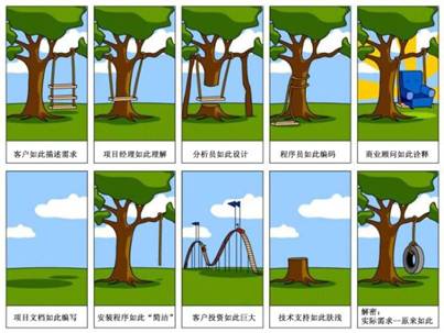 在信息化高速发展的今天,构建与时俱进的信息化系统已成为所有政府、企事业单位的重点课题之一。然而在软件项目实施过程中,进度超期、经费超预算、变更频繁的现象层出不穷,甚至有许多项目根本无法达到预期的目标,更谈不上为业主创造真正的效益。归根结底,软件需求实践这一共同的软肋是问题根源之所在。 talent.mypm.net service.mypm.net 引言 项目管理培训 项目管理者联盟 关于软件项目所存在的问题,互联网上曾经流传着一幅漫画(如图1所示),它十分生动地展现了这些问题。也许很多人看完之后只是一笑置之,但如果我们认真剖析后面的东西,还是会给我们的工作带来许多启发的。 service.mypm.net training.mypm.net talent.mypm.net 项目管理者联盟 项目管理者联盟 PgMp.mypm.net blog.mypm.net 图1 需求“迷途” 项目管理者联盟 项目管理者联盟 沟通失真 项目管理者联盟 www.mypm.net 究其原因,这幅漫画给人最大的启示就是在需求沟通过程中产生了严重的失真,从客户的描述到项目经理的理解、分析员的设计、程序员的编码、商业顾问的诠释,每个角色都根据自己的特点和需求对信息进行了不同的加工,从而导致信息的内容有了很大的改变。因此,对于软件需求工程而言,克服沟通失真就成了一个要点。 pmp.mypm.net 项目管理者联盟 根据相关的研究显示,在信息的传递过程中,如果没有采取任何措施,那么在沟通过程中信息衰减可能的最大值高达60%。而在软件开发过程中,需求信息通常要经历用户代表、需求人员、设计人员再到开发人员,因此最坏的情况下,开发人员获得的信息仅是原来的8.4%(如图2示),这是一个十分可怕的结果。 项目管理者联盟文章 项目管理者联盟 blog.mypm.net 图2信息失真 项目管理者联盟 项目管理者联盟 怎样才能够更好地避免这种问题的出现呢?其实关键的手段有两个: pmp.mypm.net 项目管理培训 文档:如果信息在传递的过程中仅靠口口相授的话,就难免发生遗忘、加工等情况,因此必须在这个过程中有效地利用文档,将达成共识的信息文档化。但这种方法只是用来辅助沟通的,而不是代替沟通,这一点在后面还会提到。 项目管理者联盟 项目管理者联盟 Review:在此有意使用了英文,因为国内常将其翻译为“评审”,但这一翻译却容易给人误导。评审在很多人的脑海中就是得出一个通过与否的结论,这也是导致需求评审工作流于形式的罪魁祸首之一。顾名思义,Review就是再(Re)看(View)一遍的意思,其本质含义是通过再次的审读,尽早地暴露出错误。而最简单、有效的Review就是在用户代表阐述了需求之后,需求分析员用自己的语言再复述一遍,以确保沟通没有失真。 项目管理者联盟 PgMp.mypm.net 隐喻:经理叫来了小张,然后就下一阶段的工作做出了一些重要的指示和安排:“$%#^@(*)#@……”。 项目管理者联盟 项目管理者联盟 小张正要扭头走的时候,经理叫住了他,说到:“你简单地说说看,我刚才给你交待的任务有哪些”(看来管理人员早已掌握了这一招)。 项目管理者联盟 blog.mypm.net 提示:如果有一个测试人员对你说:“我前天仔细测试了一下你写的程序,发现一个问题也没有,恭喜你!”。你会怎么想呢? 项目管理论坛 club.mypm.net a. 觉得自己的程序写得很好! 项目管理者联盟 b. 觉得测试人员方法不得当或测试不细致。 项目管理者联盟 项目经理博客 我想大多数人都会做出“b”的选择!可是到了需求评审时为什么却转了180度的弯呢?为什么期望需求评审时一点问题也没有呢? 转自项目管理者联盟 项目管理论坛 “沟通失真”高度概括了其中所蕴藏的问题,但如果我们细细地思考第1、2、3、4、10幅图(这五幅图中的景象与需求活动有很大的相关性),并将其两两比较就会得到一些有益的启发。下面我们就一起来看看。 项目管理者联盟 项目管理者联盟 客户:放大需求 项目管理者联盟 项目管理者联盟 当我们比较图1中的1幅和第10幅图时,就会发现用户在描述自己的需求时做了许多“添砖加瓦”的事。“用户要么不会说,要么就会添油加醋”的现象,在我的实践中是屡见不鲜的。而在这种现象的背后有什么潜在的原因呢?我认为至少有两方面关键因素: bbs.mypm.net www.mypm.net (1)客户希望支付的成本尽可能少,获得的效益尽可能多 项目管理者联盟 club.mypm.net 这种思维对于任何一个客户、任何一个人而言都是本能反应。而当用户对开发成本越不了解时,这种心态就会越强烈,更加担心自己“亏损”了;因此在需求协商时就会采取尽可能增加功能的方法来降低“亏损”的风险。 项目管理者联盟 项目管理者联盟 要有效地克服这个因素的困扰,核心的要点在于建立客户对开发团队的信任度,而建立信任度的要点有两个方面:一是需求人员必须提升自己的专业主义(关于这一点我将在后续的文章中说明);二是需求人员要多站在用户的角度想问题,让用户感觉需求人员的目标是帮助自己解决问题,而非一味谋取利益。 项目管理者联盟