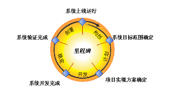 3.4 里程碑驱动的阶段推进模式PgMp.mypm.net 每个小项目都必须有里程碑式的标志性成果,然后,再推进下一个里程碑的阶段性工作,这样就能逐步完成并控制住整个项目的进度和质量,每个阶段的成果都能够鼓舞项目组和用户的信心,从而更加有力地推动了项目向前发展。项目管理者联盟 针对企业信息化建设,我们将其划分为系统目标范围确定、项目实现方案确定、系统开发完成、系统验证完成和系统上线运行五个里程碑。项目管理者联盟 对于每一项工作,都设定一个里程碑,或者说一个检查点,安排该项工作的完成时间。每一项工作的完成,都是对既有工作的总结,同时标志下一个工作的开展,以此确保整个实施工作能够有序地开展。
