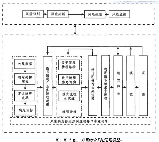 BPR的实施是一项高风险与高回报相伴随的复杂的系统工程。,成功实施BPR能让图书馆的关键绩效得到明显提高,如信息处理周期迅速缩短,成本大幅度降低,顾客满意度、信息服务质量得到显著提高等。可以实现实物馆藏物流和虚拟馆藏信息流的有机结合,有利于把图书馆改造成知识管理型组织。但是,BPR项目不可避免地要受到来自技术风险、经济风险、资源风险、管理风险、人员风险、环境风险、社会政治风险等方面的影响。从BPR的发展历程来看,其实施的风险很大,既需要投入大量的人力、财力、物力,又只有近30%的项目达到预期目标。而正当图书馆用大量的统计资料来实现图书馆系统化管理和追求工作绩效时,却忽略了全球信息战略影响下追求高利润、高效信息技术条件下的风险格局和风险转让。所有这些风险对图书馆BPR项目具有不可忽视的影响。经验表明,风险管理在项目管理中有着极其重要的作用。如果没有有效的风险管理,就有可能导致一个规划和管理良好的项目陷入困境并失败。因此,图书馆BPR项目的实施必须着眼于本馆的实际,考虑技术、管理、政策、经济、文化等各个方面的因素,分析各种不确定性因素。在图书馆BPR项目中实施和运用科学的风险管理,有利于提高图书馆BPR项目的成功率。项目管理者联盟