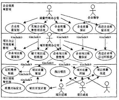 根据4.1节的组织结构分析,可以抽象出如下用例模型的角色:企业领导,质量管理办公室,项目管理办公室,项目经理和项目成员。如图3所示,产品开发项目质量管理分3级实现:企业级,项目管理办公室级和项目级。项目管理者联盟