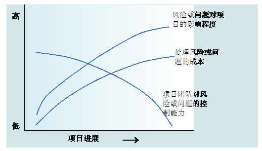 我们都知道,项目进展的越深入,风险对项目的影响就越大,从而处理风险的成本越高。越是在项目早期,团队对项目的可控性越高。所以,风险管理的原则之一就是越早越好。尽量的提前识别风险,应对和消除风险的成本就越低,风险转化成“问题”的概率就越小,对项目的冲击自然就越小。项目管理者联盟