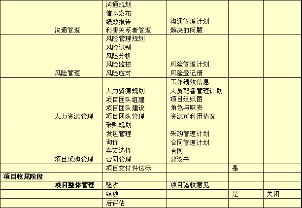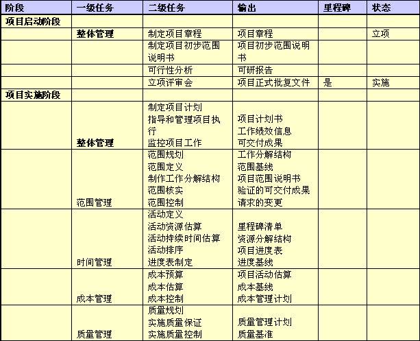 一个企业内部存在各种不同类型的项目,其中可能包括软件开发项目、硬件项目、工程项目、业务发展项目、软课题研究项目等,在项目管理方法定义方面,难点就在于企业必须参照 PMBOK 和 RUP 等业界成熟方法论,结合企业的项目管理特点和项目管理需求,为每种类型的项目管理定义出项目管理流程。其中包括项目的主要阶段划分,每个阶段的主要任务,每个任务的输入和输出,项目生命周期的主要里程碑和主要状态定义。下表是如何基于 PMBOK 建立项目管理方法的一个例子,用来说明项目生命周期管理模型建立的具体方法:项目管理者联盟
