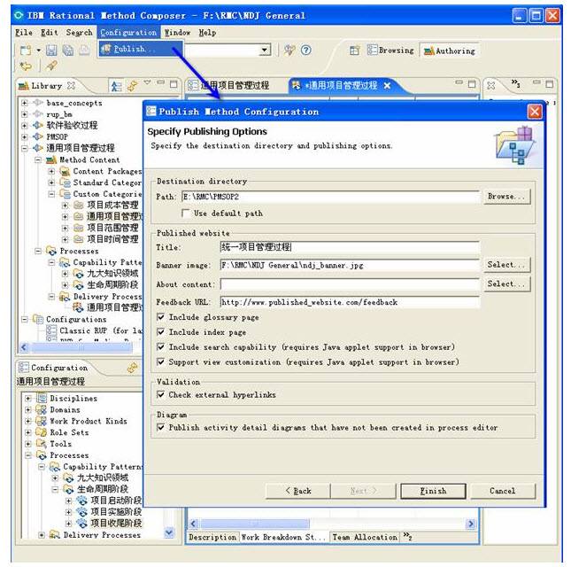 至此,我们就已经完成了基于企业的标准项目管理方法,使用 RMC 建立可视化的方法网站的全部过程。项目管理者联盟