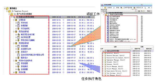 RPM 内置了模板机制,它是 IBM 在 RPM 中支持项目管理实践经验共享和方法重用的关键策略。在 RPM 的流程模板中,如图17所示,不但包含的项目管理过程所需的工作分解结构、过程文档、任务描述及处理时长、任务参与人员及技能要求、记分卡以及常见问题风险等,而且通过 RPM 和 RMC 内置的导入导出功能,可以直接将 RMC 中定制的项目管理方法导入到 RPM 中,生成可执行的项目管理流程模板,使项目管理团队能够在不知不觉中,轻松愉快的按照组织预定义的项目管理方法,完成项目管理工作。这不但从根本上解决了项目管理流程执行力的问题,还为企业提供了良好的知识共享机制,对提高组织项目管理过程的成熟度有很大帮助。项目管理者联盟