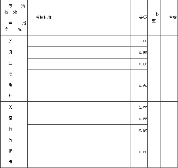 第二部分是其主体部分,即关键绩效指标部分。而在这一部分,又可以分成两个纬度,分别是关键业绩指标(business indicator)和关键行为标准(behavior standard),从业绩和行为两个纬度考核一个员工的绩效表现,使员工的绩效得到全面综合的衡量和评估。这其中,每一类指标又包括绩效指标的名称、考核标准、考核等级、权重等内容。项目管理者联盟