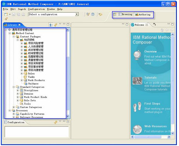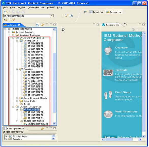 3> 步骤三、完成"标准类别"和"定制类别"的定义。在 UMA 中将方法内容分成三类:为工作定义(任务和活动的规程)、工作产品(域和工作产品种类)以及角色(角色集)。而在 RMC 中完成"方法内容"后,为了便于进一步进行"功能模式"的开发,此时一般会对实现的方法内容进行分类。如图8所示, RMC 中包含"标准类别"和"定制类别"两个分类目录,它们将决定方法内容在最终的发布网站上的显示。"标准类别"是 RMC 中预定义好的分类方法,它反映了 UMA 的标准分类方法,包含了"规程"( Disciplines )、"领域"( Domains )、"工作产品类别"( Work Product Kinds )、"角色集"( Role Sets )和"工具"等五个标准分类目录,每种分类中只能保存一种类型的"方法内容",分别用来对任务、工作产品、角色和指导信息进行分类。"定制类别"与"标准类别"不同,它里面可以包含任意多种不同的"方法内容",也可以包含多个"标准类别",可以使用它实现根据用户的条件对方法内容进行分类,定义嵌套类别的树结构,允许用户根据这些类别系统地浏览方法内容和流程,而这些"定制类别"最终可以作为方法发布页面上的视图,决定方法发布后的最终显示界面。training.mypm.net