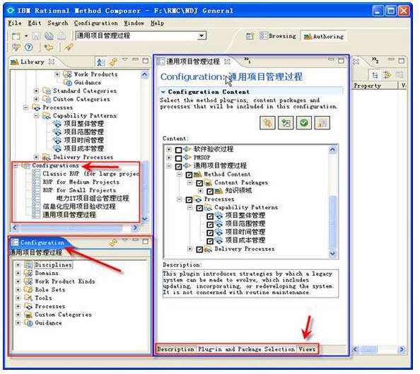 步骤四、定义"方法配置"( Configuration )。方法配置是选定方法插件、方法包和交付流程的集合,它定义了方法库的逻辑子集。在 RMC 中,最终方法网站的发布是基于"方法配置"进行的,它使用"方法配置"来最终决定发布的网站中将要包含的"方法内容"和"流程",以及发布网站的最终显示视图。建立新的"功能模式"时,将提示你选择缺省的"配置",以决定在"功能模式"中可以使用的方法内容。有关"方法配置"的具体内容如图9所示:项目管理者联盟