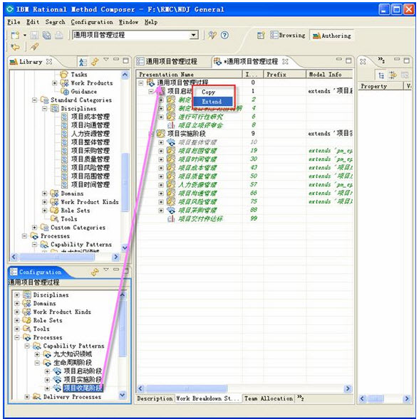 5> 步骤六、定制"交付流程"。"交付流程"代表一个方法应用于某一领域的一个端到端的流程实例,它为某类方法的执行提供完整的,覆盖整个生命周期管理流程模板。新的"交付流程"一般会通过重用已有的"功能模式",或在已有的"功能模式"的基础上,经过少量修改实现。这可以通过"交付流程"对"功能模式"的复制和扩展两种重用模式来实现。其中,复制表示将"功能模式"中的所有内容复制到"交付流程"中,之后对"功能模式"的修改将不会影响"交付流程",反之益然;而扩展模式则表示在"交付流程"引用"功能模式"中的内容,因此,对"功能模式"的修改将会同步影响到"交付流程",而且"交付流程"中"功能模式"中的内容为只读。blog.mypm.net
