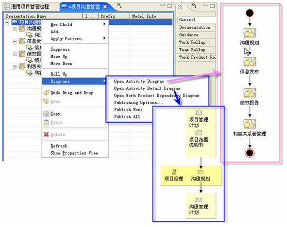 然后,用户还必须手工定制"活动流程图",以可视化的方式表示活动之间的逻辑关系,如图13所示, RMC 还会根据"功能模式"中包含的具体"方法内容"的定义,自动产生"详细活动图"。项目管理者联盟