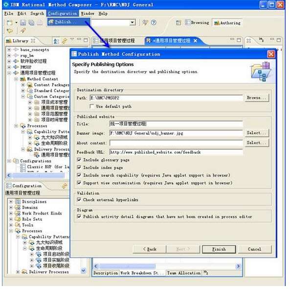 6> 步骤七、将"配置"发布成网站。在进行配置的最后发布前,一般我们会再次光顾 RMC 的"定制类别"部分,在类别中加入刚刚完成的"交付流程"或"功能模式",以便能够按照我们设计的视图,在发布网站上显示方法内容。然后我们就可以正式进行配置发布流程。如图15所示,选择要发布的配置,然后在方法发布配置窗口中制定网站发布路径及相关配置信息,完成发布流程。项目管理者联盟