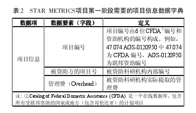 STAR METRICS项目第一阶段需要的数据包括:项目信息、个人信息、项目直接费用情况、采购信息以及子课题信息等。以项目信息为例,数据字典给出了项目信息中包含的要素(字段)以及该要素(字段)的具体定义,见表2。