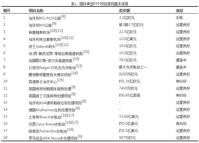 本文选取了18个国际典型PPP案例,案例信息来自经济合作与发展组织(OECD)、欧洲投资银行(European Investment Bank)等主要国家和地区的投资机构、承包商、运营商、政府等的权威研究报告或资料。案例项目涉及公路、机场、港口、铁路、电站、垃圾处理、水处理等领域,涵盖了国际上主要的PPP项目类型(表1)。项目管理者联盟