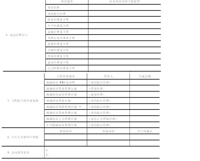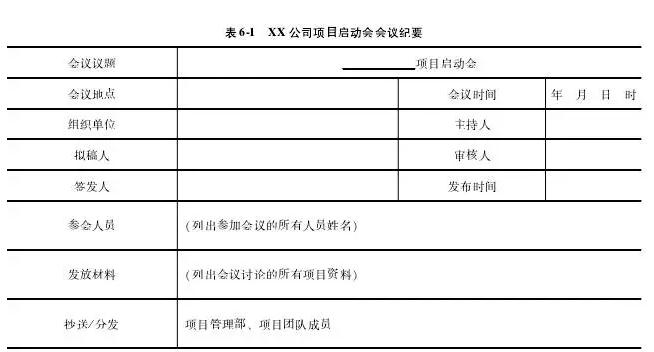 7 项目启动会结束后,项目执行经理编制《项目启动会会议纪要》(见表6-1),并经项目经理审核后发布。相关责任人按照纪要要求开展工作。www.mypm.net