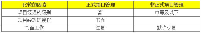 |   早期,一些项目开发者在编写项目方针和程序文档上花费时间和资源,主要目的是为了安抚客户。项目管理出现后,建立正式文档大多也是为了给客户看。service.mypm.net   20世纪80年代初,是纸张文档最为兴盛的时期。为了符合规范,项目经理们快被书面工作淹没了,繁忙的程度使他们几乎没有时间去参与实际的项目管理。pmp.mypm.net   真正的成本节约发生在20世纪90年代初期,是随着并行工程的发展得以实现。并行工程方法采用分段处理的方式,将工作分为几个连续的系列,各系列同时展开,从而大大缩短了产品开发时间。正式的指南(guidelines)开始被清单(checklist)所取代,这种清单对细节描述较少,大多是概述性的。blog.mypm.net   表1 正式项目管理和非正式项目管理的比较项目管理者联盟  pmp.mypm.net
