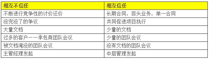 也就是从这个时候起,非正式的管理方式开始走进人们的视线。表1列出了正式项目管理和非正式项目管理的几个不同点。从中可以看到,两者主要的不同点在于书面工作量的差异。方针和程序文档的编写代表了项目管理的正式性,清单则代表了非正式性。项目管理论坛   不过,需要指出的是,非正式项目管理并不能消除全部项目书面工作,它只是把书面工作的需求降低到能够接受的最低程度。事实上,从正式过渡到非正式,项目管理的组织文化也要发生转变。service.mypm.net   “非正式项目管理”的四个条件项目管理者联盟   概括而言,非正式项目管理组织文化有四个基本要素:信任、沟通、合作和协作。转自项目管理者联盟   信任转自项目管理者联盟   信任参与项目实施的每个人至关重要。早晨,当你开车去上班时,一路上也许踩了几十次刹车。尽管你从来不认识设计刹车、制造刹车或安装刹车的人,但你毫不担心刹车能否管用。此时,你已经将你的生命交给过无数个从来不认识的人。可是,当你坐在自己的办公室,为什么拒绝团队其他成员做出一个很小的决定呢?项目管理者联盟   信任是成功进行非正式项目管理的关键。没有信任,项目经理和项目发起人不得不要求进行所有的书面工作,而这仅仅是为了确保参与项目的每个人都按照预先的指示工作。项目管理者联盟   信任在建立承包商/分包商与客户之间的良好关系时同样重要。当客户和承包商之间的关系是建立在信任的基础上时,双方自然都获得了众多好处。表2列出了可以获得的收益。项目管理者联盟文章   表2 相互信任的客户——承包商工作关系带来的收益项目管理者联盟  项目管理者联盟