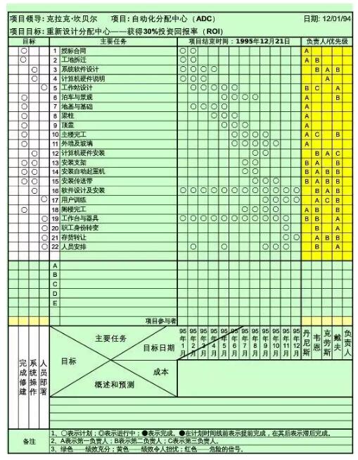 “一页纸项目管理”是一种工具,是向公司高层管理者反映项目状况和各方面负责人的绩效的一种载体。简短和全面使它成为一项非常有效的沟通工具。一页纸是一份矩形图,连接项目组成的各部分,适度忽略精确性,各组成部分的所有者也被标注在文件上,项目进展也被不同颜色或图表区分。使管理者易于理解,能够更好的把握情况。项目管理者联盟