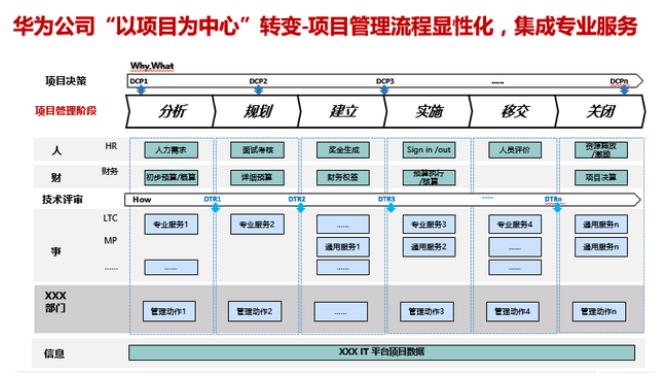 在这一系列的变革过程中,公司轮值董事长郭平牵头负责向“以项目为中心”转变的能力建设,其下成立多个变革子项目,包括“项目型组织变革项目”、“通用项目管理服务平台建设项目”、“项目管理流程建设项目”等,确保了华为公司从弱矩阵一步步走向强矩阵。www.mypm.net
