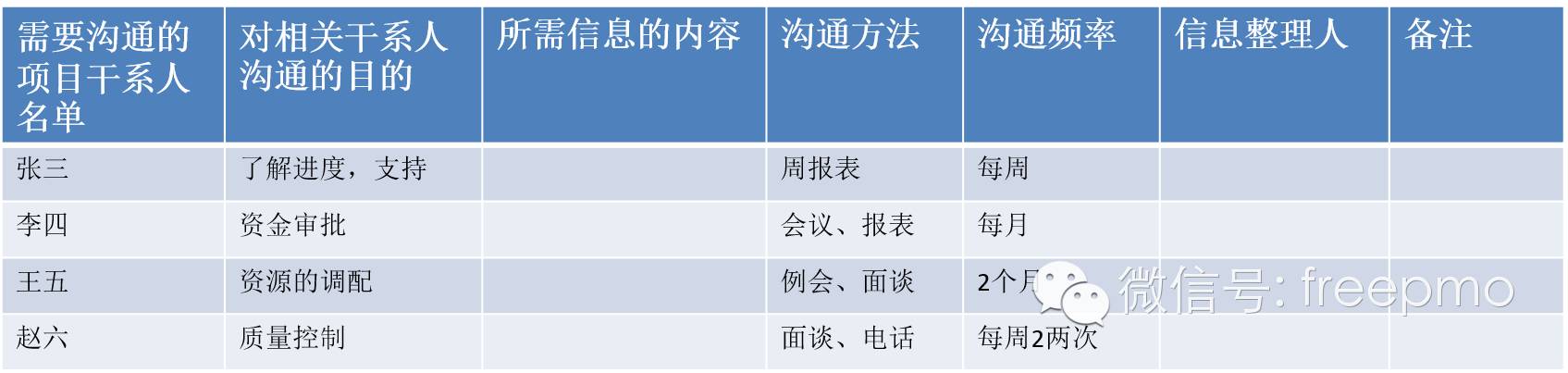 对待哪些项目干系人,什么时候沟通,以什么样的方式沟通,沟通的频率是多少。采取的方式可以是报表、面谈、电话、邮件、通报会等等。对另外的项目干系人,也存在同样的问题,也要提前计划沟通方式、沟通频率,包括日常的沟通和特殊情况下的沟通。相关的信息收集上来后,经过整理加工,形成表格、图片、统计图等简洁直观的资料,定期报给相关人员,有问题提前说,这才是一个全面的沟通。很多领导很多客户愿意看到这些东西,特别是领导。这个沟通计划并非需要长篇大论,比如,下面这个表格就是一个很好的沟通计划。