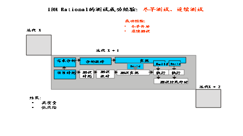 2.2 成功经验二:连续测试 测试成功经验连续测试是从迭代式软件开发模式得来。在迭代化的方法中,我们将整个项目的开发目标划分成为一些更易于完成和达到的阶段性小目标,这些小目标都有一个定义明确的阶段性评估标准。迭代就是为了完成一定的阶段性目标而从事的一系列开发活动,在每个迭代开始前都要根据项目当前的状态和所要达到的阶段性目标制定迭代计划,而且每个迭代中都包括需求、设计、编码、集成、测试等一系列的开发活动,都会增量式集成一些新的系统功能。通过每次迭代,我们都产生一个可运行的系统,通过对于这个可运行系统的测试来评估该次迭代有没有达到预定的迭代目标,并以此为依据来制定下一次迭代的目标。由此可见,在迭代式软件开发的每个迭代周期我们都会进行软件测试活动,整个软件测试的完成是通过每个迭代周期不断增量测试和回归测试实现的。 如图五所示,采用连续测试的软件成功测试经验,不但能够持续的提高软件质量、监控质量状态,同时也使系统测试的尽早实现成为可能。从而有效的控制开发风险、减低测试成本和保证项目进度。 图五、测试成功经验:连续测试
