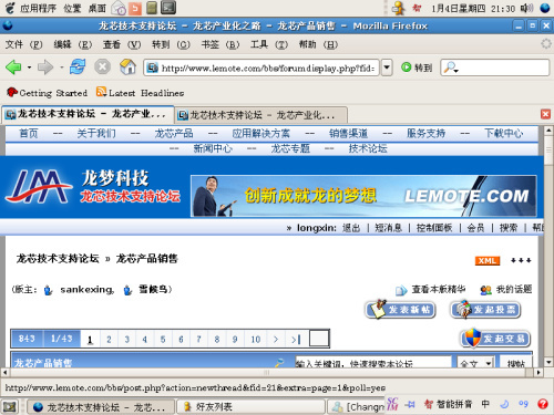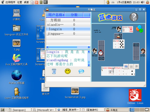 各种连线接好后,启动成功 开机画面上显示出“中科龙梦 ”四个激动人心的汉字。进入桌面后感觉操作还可以,没有什么不方便的。系统已经装好了一些常用软件。我简单的把网络设置成自动获取IP很快就上网了,在龙梦科技论坛上发了第1张贴子,还玩了在线游戏 “蓝迪游戏”。哈哈,蓝迪游戏里的人估计也是第一次看到有用龙芯电脑的人和他们一起玩吧(以前测试的不算的话),我还和他们打了招呼。我又了下IM软件 GAIM 和MSN上的朋友打了招呼 。然后又看了段龙芯的视频,从百MP3度上下载一段“蓝色多瑙河”都顺利成功了。