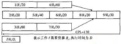 b)关键链与关键路径。对于图l所示项目,CPM确定的关键路径为2-5-6-8-9。考虑到资源约束,工作3和6的完成都需要资源R3,工作4和7的完成都需要资源R4,而工作4和7发生重叠,出现资源冲突。CCPM在考虑紧前关系约束、工作执行时间和资源约束情况下,决定项目周期的工作序列应该是1-4-1-7-9,总长70,如图2所示。根据关键链的定义。该工作序列为关键链。
