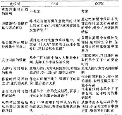 通过以上四个方面的分析发现,CPM仅是从工序时间出发先确定关键路径,然后在此基础上进行工序起止时间安排、资源调度等工作。由于CPM的这种处理逻辑,导致其在实际应用中存在着诸多局限,而CCPM则从根本上改进了这些问题,如表1所示。