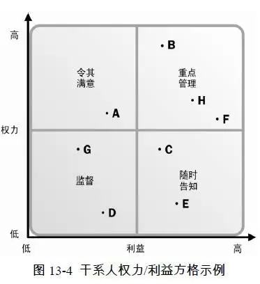 简单说,B、H、F这三类干系人对项目的成果最关注,同时又对项目有最大的决策或财务权力或影响力,是项目经理需要重点管理的干系人。依次类推,项目经理对其它不同方格中的干系人可以采用不同的管理策略。