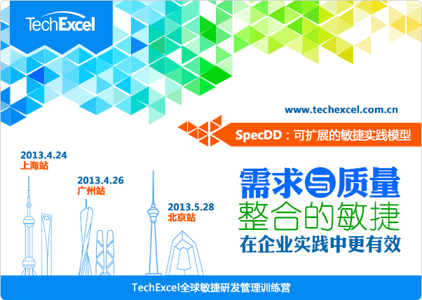 针对上述情况,“TechExcecl全球敏捷研发管理训练营”组织开展有关“需求与质量整合的敏捷在企业实践中更有效——SpecDD:可扩展的敏捷实践模型”的培训(咨询电话:400-826-1113 网址:http://www.techexcel.com.cn),旨在为企业寻找一种更好的、均衡和可扩展的整合型敏捷开发方法。