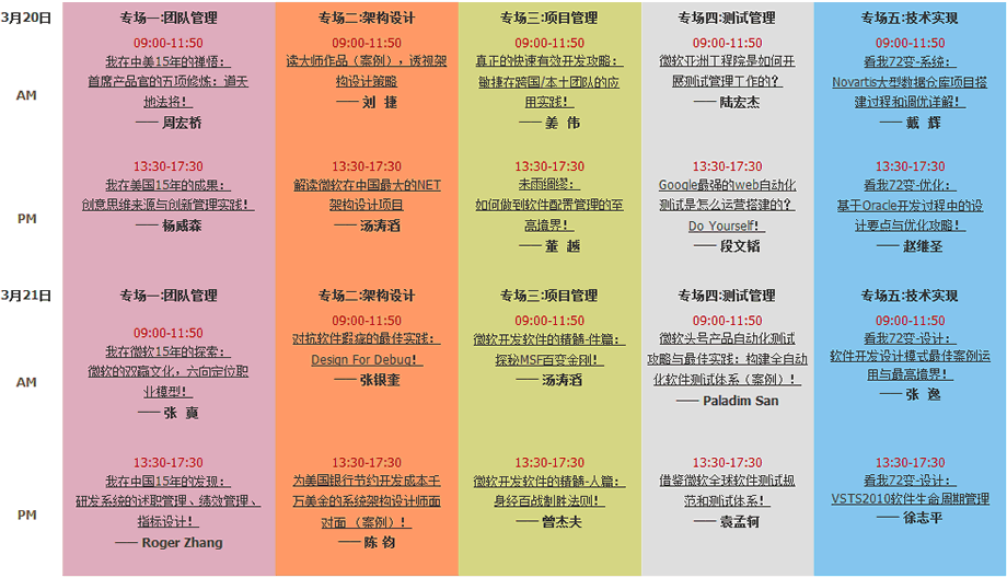 大会安排了二十门精选课程,专门介绍软件开发团队的组队模型,产品开发周期,敏捷开发攻略,如何制定自动化测试体系和软件配置管理策略,软件开发管理流程等问题。还面向高级软件架构师、核心骨干人员,讲述具体的软件设计模式,软件架构攻略和系统调试方式。15年系列华人专场,将讲授创新思维开发管理、成为首席产品官等精华课题。